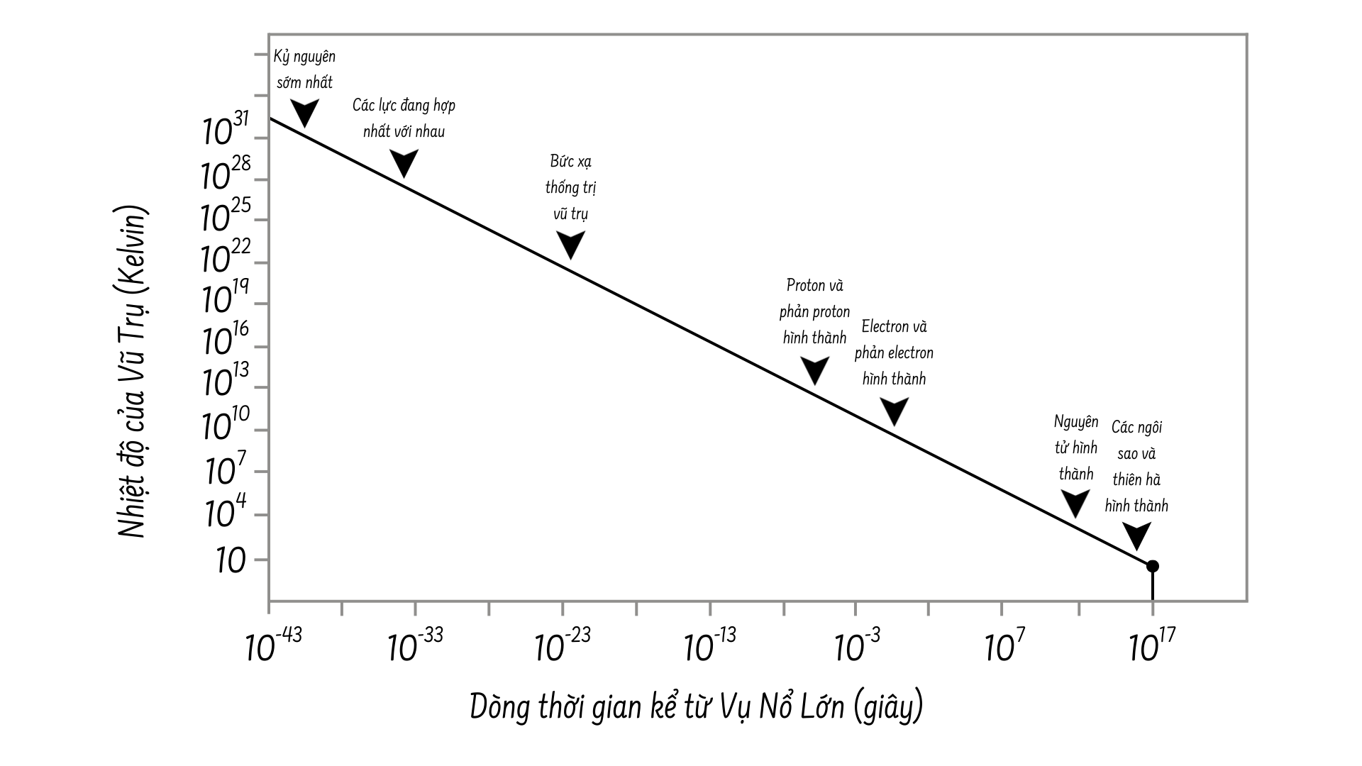 Chúng ta hãy bắt đầu với vài phút đầu tiên sau Vụ Nổ Lớn. Đầu tiên, vũ trụ sẽ nguội đi khi nó giãn nở. Trong phần rất nhỏ của giây đầu tiên, vũ trụ nóng đến mức không thể tưởng tượng được. Khi 0,01 giây trôi qua, nhiệt độ đã giảm xuống còn 100 tỷ Kelvin (1011 K). Sau khoảng 3 phút, nó đã giảm xuống còn khoảng 1 tỷ Kelvin (109 K), vẫn nóng hơn khoảng 70 lần so với bên trong Mặt Trời. Sau vài trăm nghìn năm, nhiệt độ đã giảm xuống chỉ còn 3000 Kelvin và vũ trụ tiếp tục nguội dần kể từ thời điểm đó