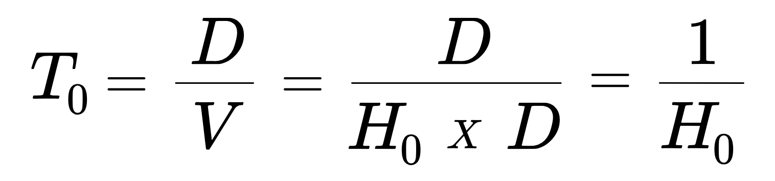 Chúng ta hãy gọi tuổi của vũ trụ được đo theo cách này là T0. Để đơn giản hoá vấn đề, hãy giả định rằng tốc độ giãn nở là không đổi kể từ khi vũ trụ hình thành. Trong trường hợp này, thời gian cần thiết để một thiên hà di chuyển một khoảng cách d ra xa khỏi Dải Ngân hà Milky Way (hãy nhớ rằng ban đầu các thiên hà đều nằm cùng nhau trong một thể tích rất nhỏ) là T0 = D/V