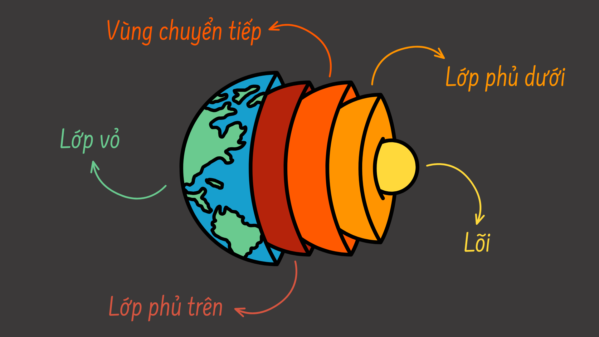 Ở cấp độ cơ bản nhất, Trái Đất gồm có ba lớp: nó có lớp vỏ mỏng và nhẹ ở trên bề mặt; lớp phủ đậm đặc hơn một chút ở giữa và một lõi kim loại dày đặc ở trung tâm. Tại đây, lớp phủ lại được chia thành ba lớp con: lớp phủ trên, vùng chuyển tiếp và lớp phủ dưới.
