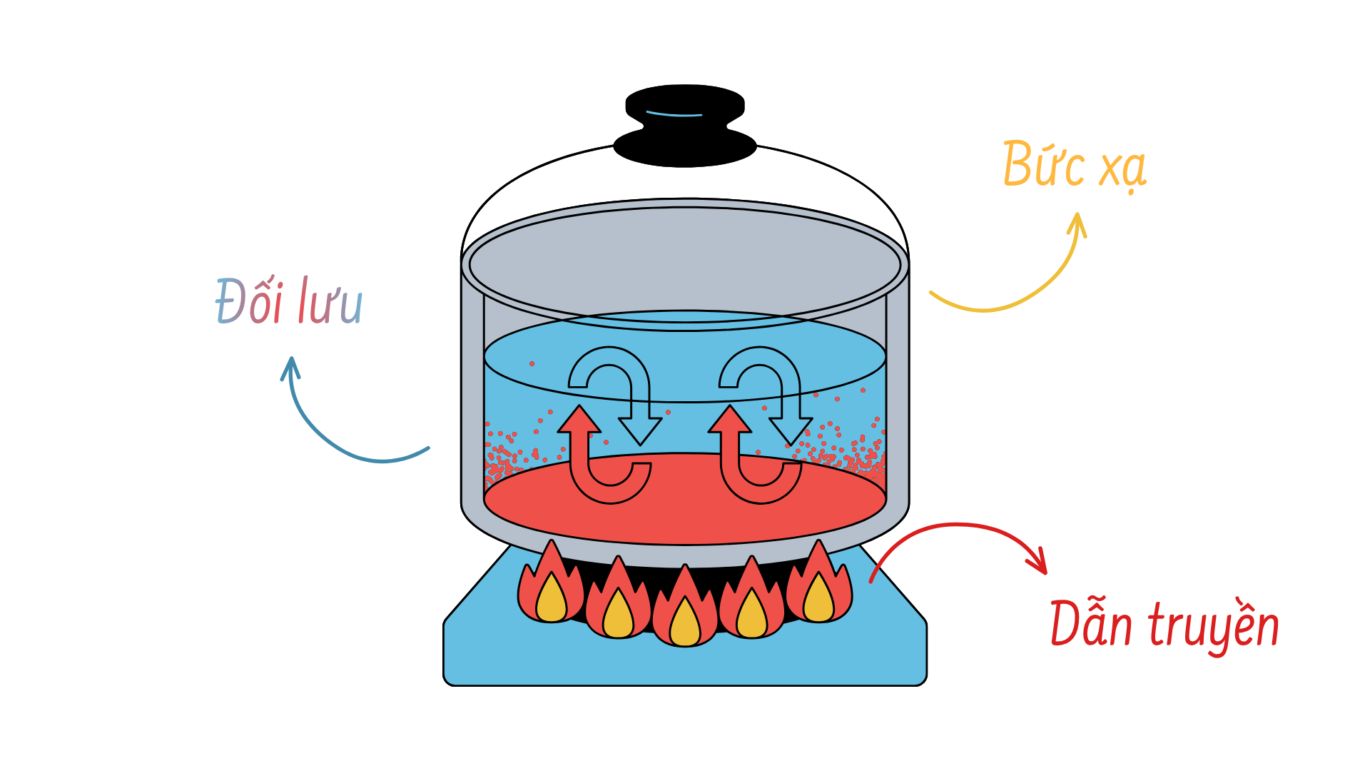 Đối lưu cũng là một cơ chế khá quen thuộc. Ví dụ, quá trình đối lưu sẽ xảy ra bất cứ khi nào bạn đang đun nước. Lúc đầu, quá trình này diễn ra chậm, vì các nguyên tử đang bị kích thích bởi nhiệt trong thành nồi tiếp xúc với các phân tử nước lạnh và sử dụng cơ chế dẫn nhiệt để làm các phân tử nước di chuyển. Nhưng một lúc sau, khối nước được làm nóng ở đáy bắt đầu nở ra và dâng lên tới các lớp nước lạnh hơn và đặc hơn ở phía trên, dần dần truyền nhiệt lên bề mặt. Đồng thời, các khối nước bề mặt lạnh hơn và đặc hơn sẽ chìm xuống đáy. Quá trình này diễn ra ngày một nhanh với các cột nước dâng lên và chìm xuống cho đến khi đạt đến mức sôi lăn tăn. Thông qua vòng tuần hoàn đối lưu của nước nóng đi lên và nước mát đi xuống, một lượng nhiệt sẽ nhanh chóng được truyền đi trong toàn bộ hỗn hợp chất lỏng một cách vô cùng nhanh chóng và hiệu quả.