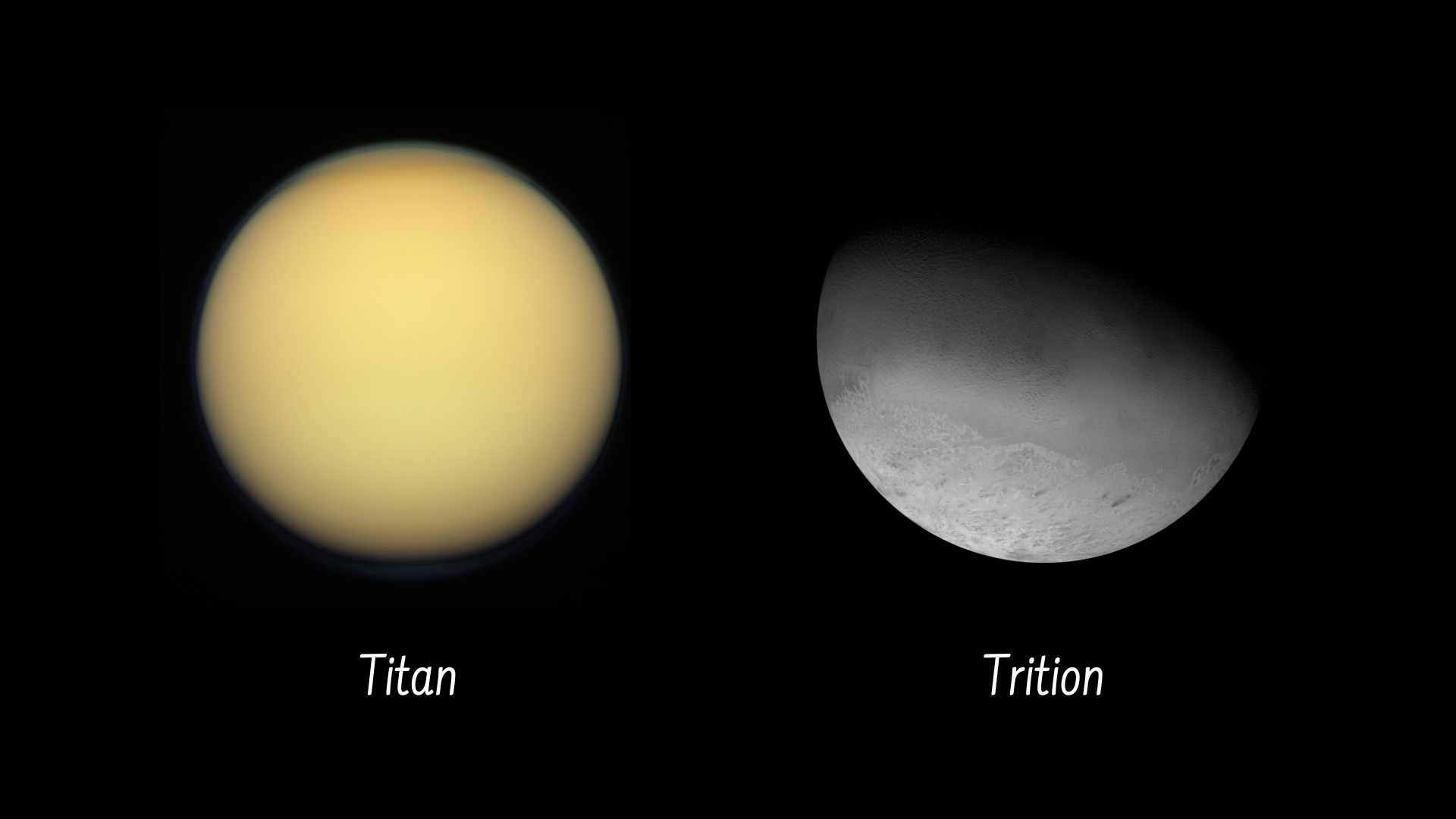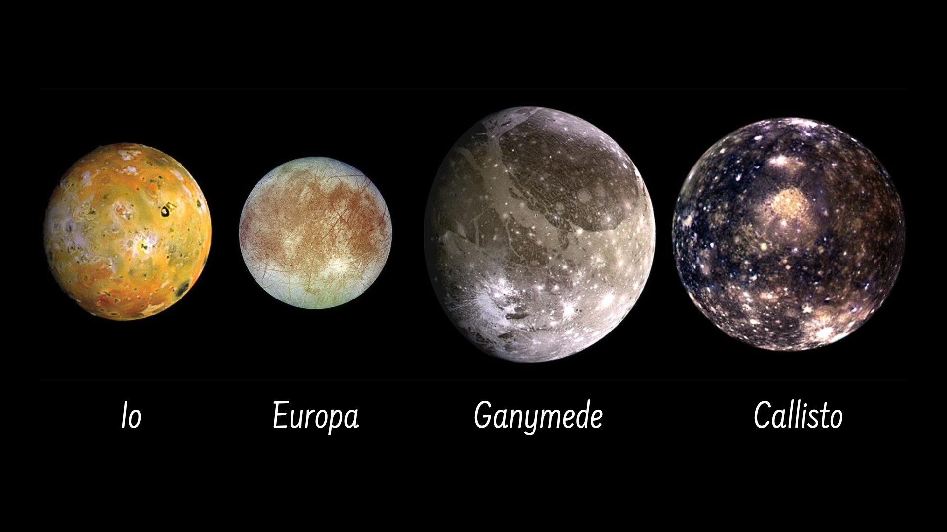 Các mặt trăng lớn nhất có kích thước bằng với các hành tinh nhỏ. Bên cạnh Mặt Trăng mà chúng ta đang nhìn thấy hàng ngày trên Trái Đất, bộ sưu tập này còn có bốn mặt trăng lớn nhất của Sao Mộc (được gọi là các mặt trăng Galilean – được đặt theo tên người phát hiện ra chúng) và các mặt trăng của Sao Thổ và Sao Hải Vương (Titan và Triton).