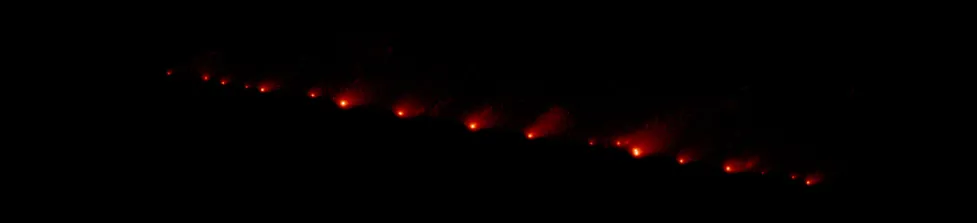 Trong hình ảnh của Sao chổi Shoemaker–Levy 9 được chụp vào ngày 17 tháng 5 năm 1994 bởi Kính viễn vọng không gian Hubble của NASA, bạn có thể thấy sao chổi đã vỡ ra thành 20 mảnh và đang hướng tới Sao Mộc.