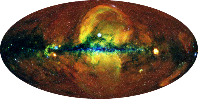 Cuối cùng, bên cạnh vùng trung tâm của Dải Ngân Hà chính là các vùng khí có màu xanh lá cây và màu vàng. Những tia bức xạ này được phát ra từ các hiện tượng cực đoan như vụ nổ siêu tân tinh và các vụ phun trào đến từ lỗ đen siêu lớn ở vùng trung tâm.