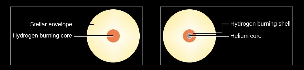Chúng ta hãy bắt đầu bằng cách xem xét các ngôi sao có thành phần tương tự như Mặt Trời và có khối lượng ban đầu tương đối thấp—lớn gấp đôi khối lượng Mặt Trời. Trước đó, các ngôi sao khổng lồ đỏ bắt đầu với một lõi heli, nơi không có dòng năng lượng nào được tạo ra, được bao quanh bởi một lớp vỏ hydro đang trải qua quá trình tổng hợp hạt nhân.