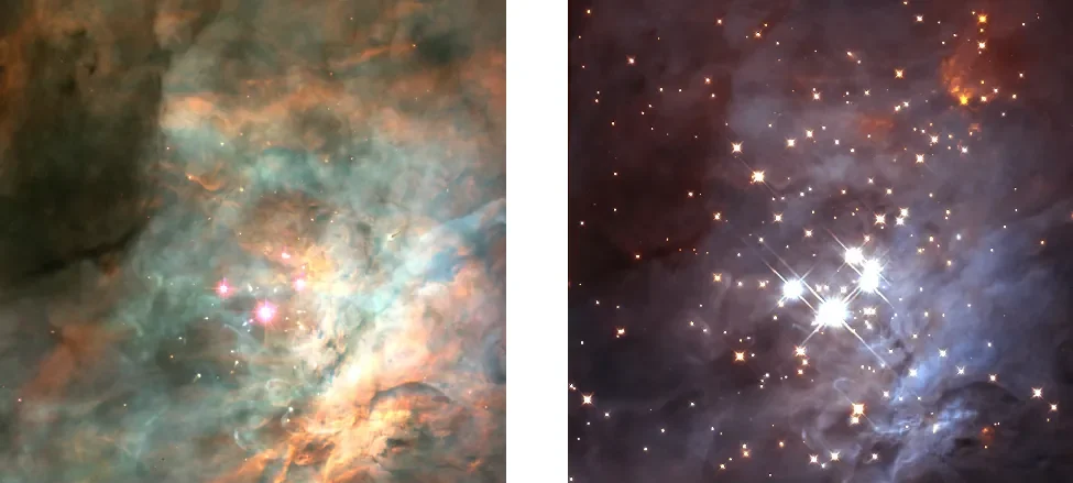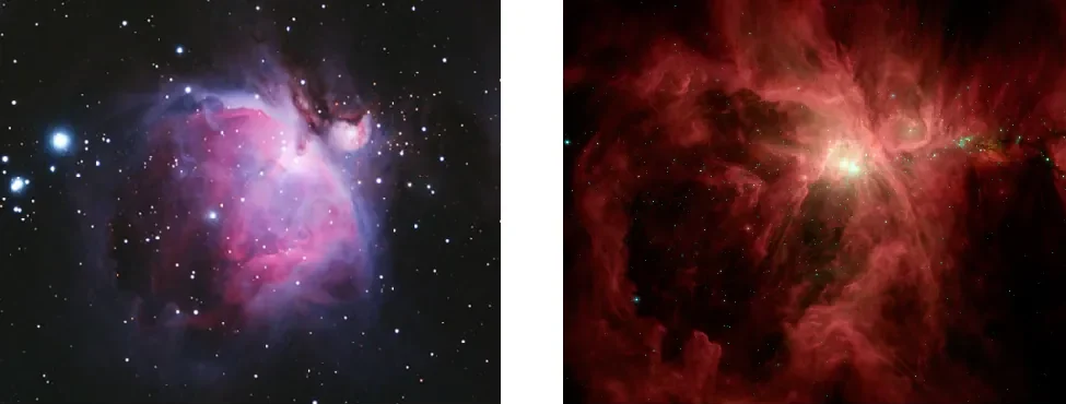 Và chúng ta có thể hoàn toàn xem “trực tiếp” quá trình hình thành này bằng cách nghiên cứu tinh vân Orion cách Trái đất khoảng 1500 năm ánh sáng. Tinh vân Orion trải dài trên một khoảng cách khoảng 100 năm ánh sáng. Tổng khối lượng vật chất nặng gấp khoảng 200.000 lần so với khối lượng của Mặt trời. Phần lớn tinh vân không phát ra ánh sáng khả kiến mà tinh vân thường phát ra sóng hồng ngoại và sóng radio.