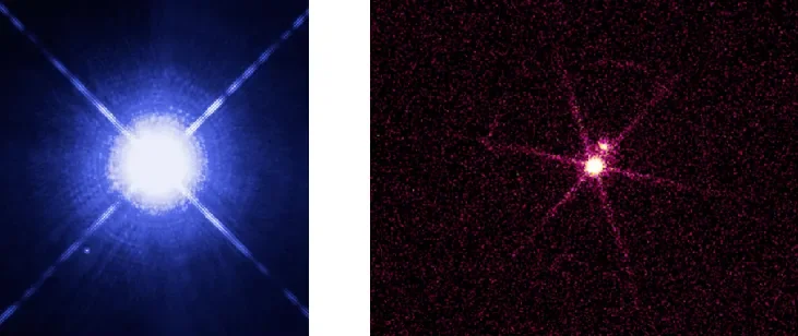 (a) Hình ảnh ánh sáng khả kiến của hệ sao đôi Sirius, được chụp bằng Kính viễn vọng Không gian Hubble, cho thấy Sirius A rực sáng. Bên dưới nó và lệch về bên trái là Sirius B mờ nhạt. (b) Hình ảnh này của hệ sao đôi Sirius được chụp bằng Kính viễn vọng Tia X Chandra. Lúc này, vật thể sáng hơn là ngôi sao lùn trắng đồng hành, Sirius B. Sirius A là vật thể mờ nhạt phía trên nó; những gì chúng ta đang thấy có lẽ không thực sự là bức xạ tia X mà là tia cực tím đã lọt vào bộ dò. Lưu ý rằng cường độ tia cực tím của hai vật thể này hoàn toàn trái ngược so với trường hợp ánh sáng khả kiến vì Sirius B nóng hơn và phát ra nhiều bức xạ có tần số cao hơn.